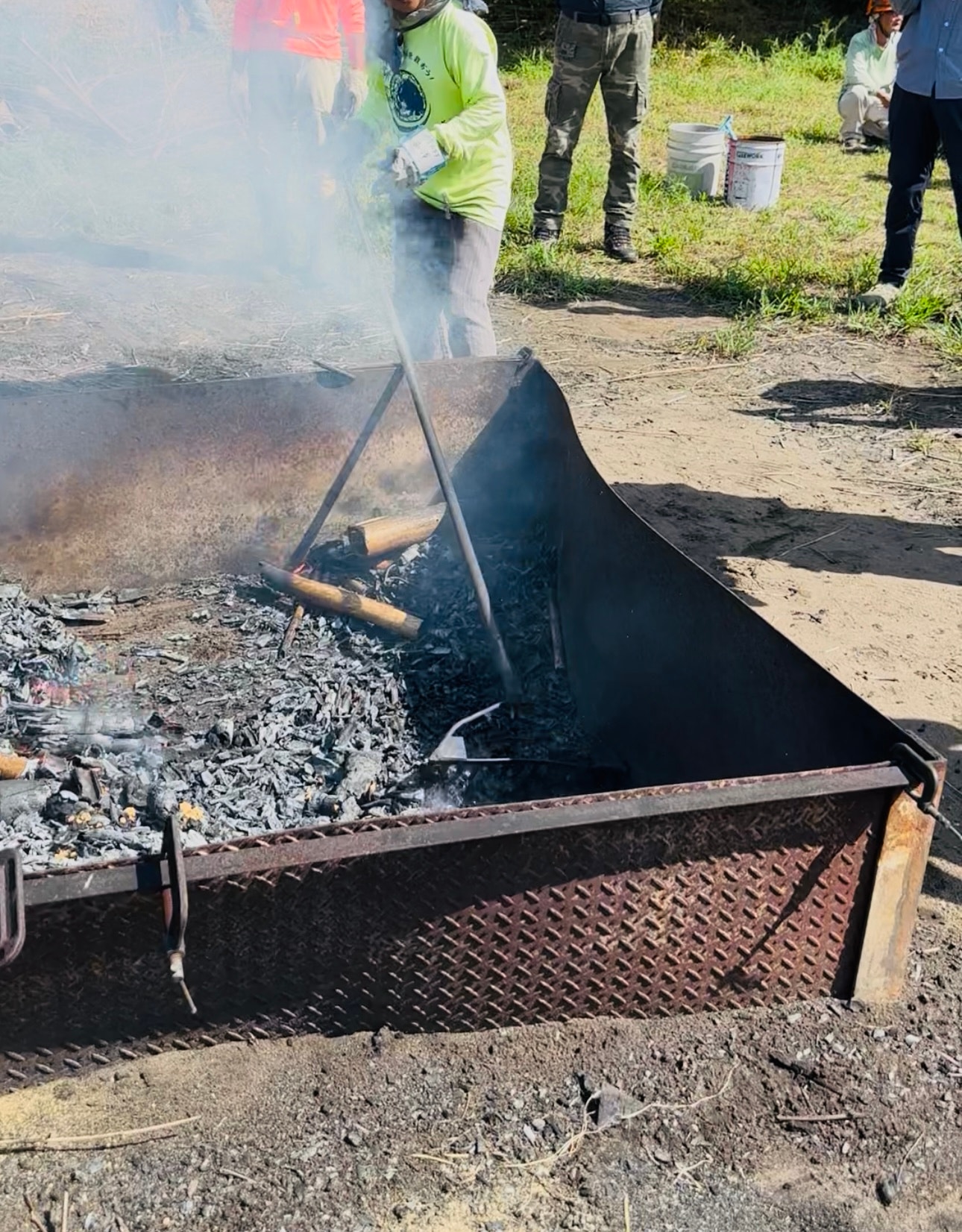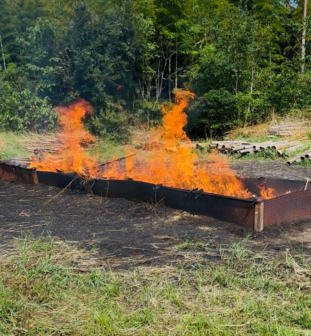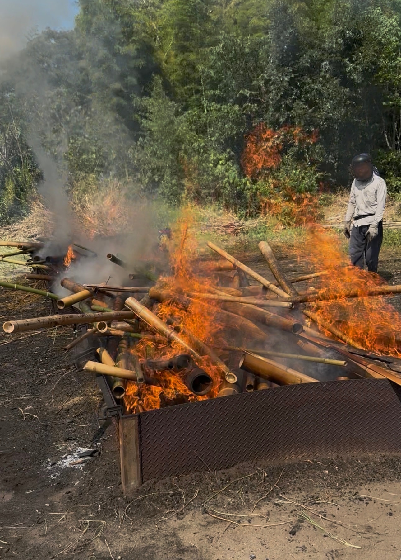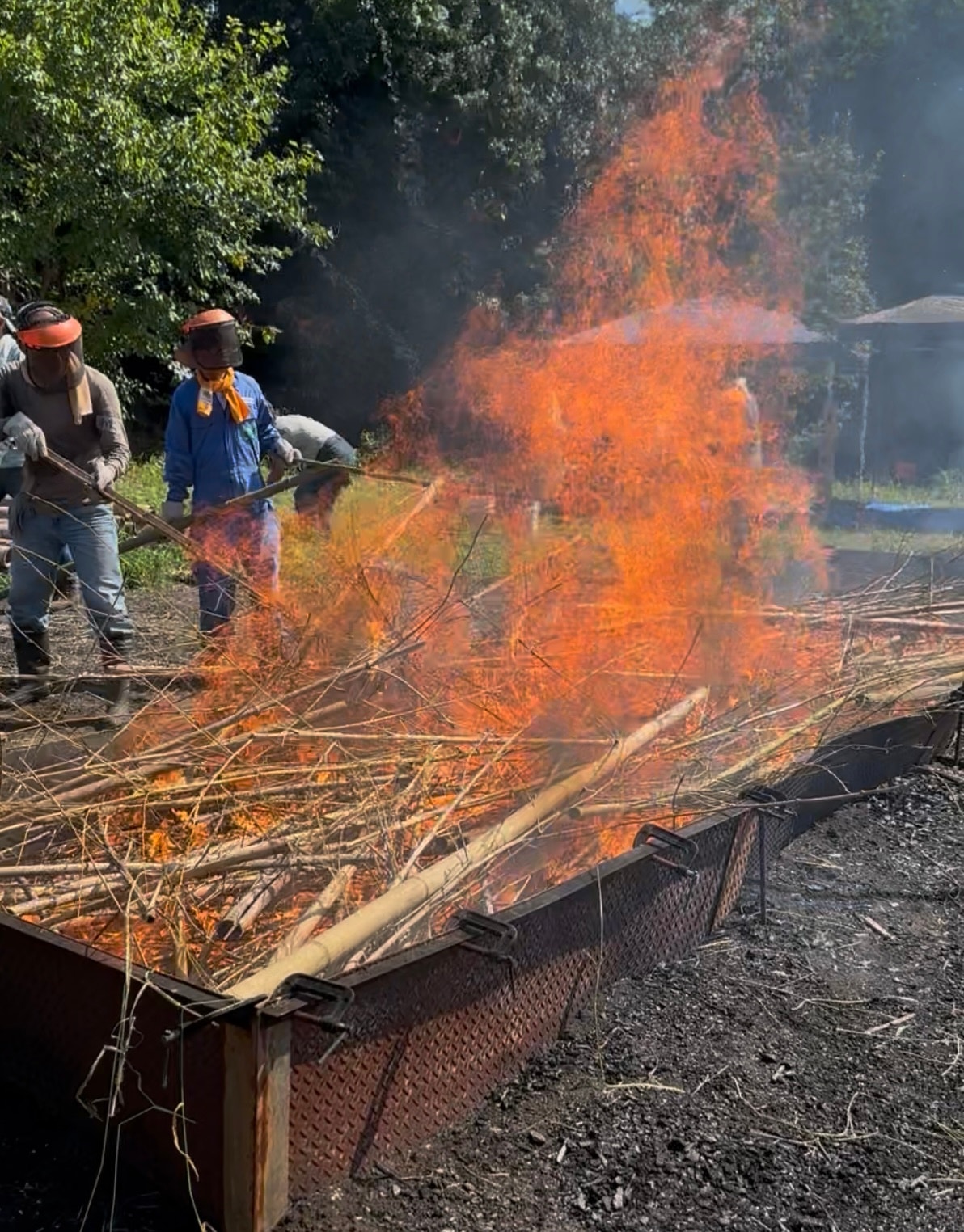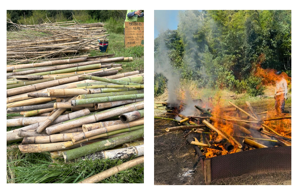 防護マスクをつけて、みんなでどんどん竹を焼いていきます。
